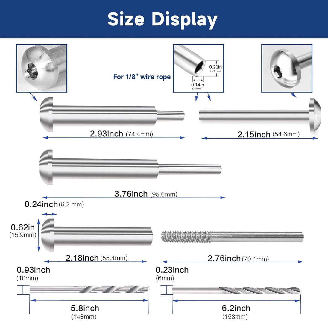 T316 Invisible Cable Railing Kit | Round-Head Receiver for 1/8" Cable (Wood/Metal Posts)