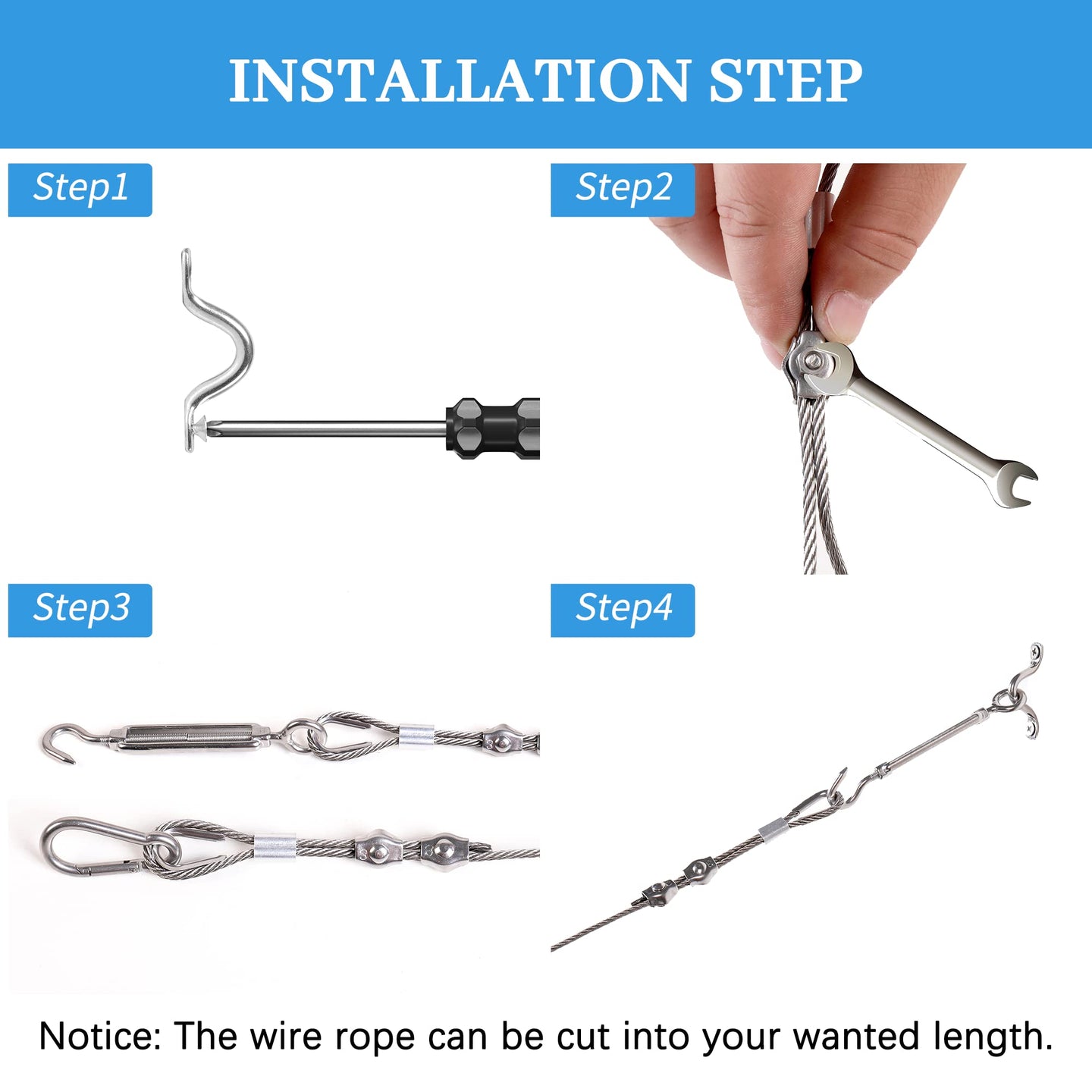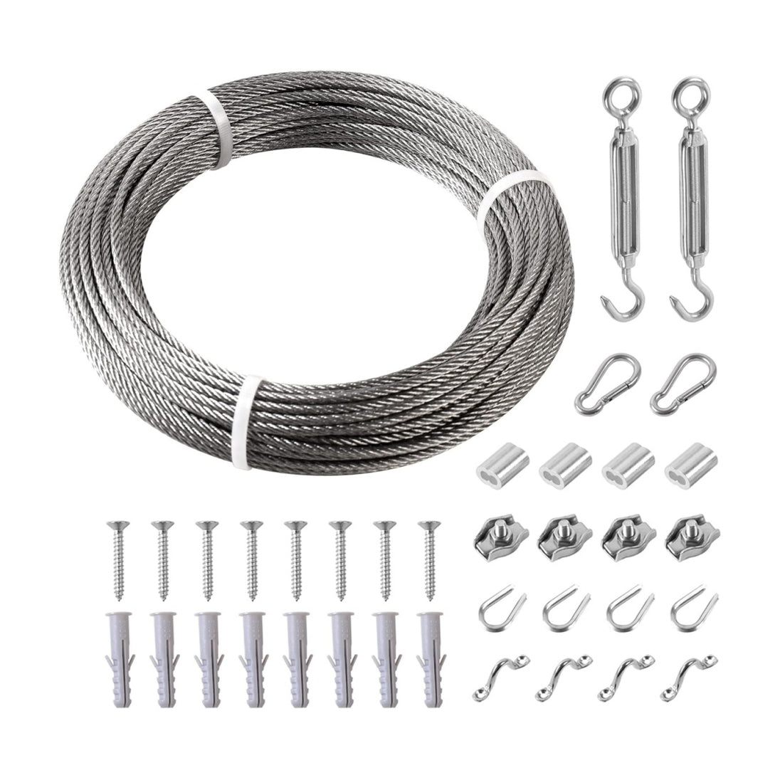 - Assemble: Loop the wire rope through the turnbuckles and snap hooks, securing the loops with the clamps.