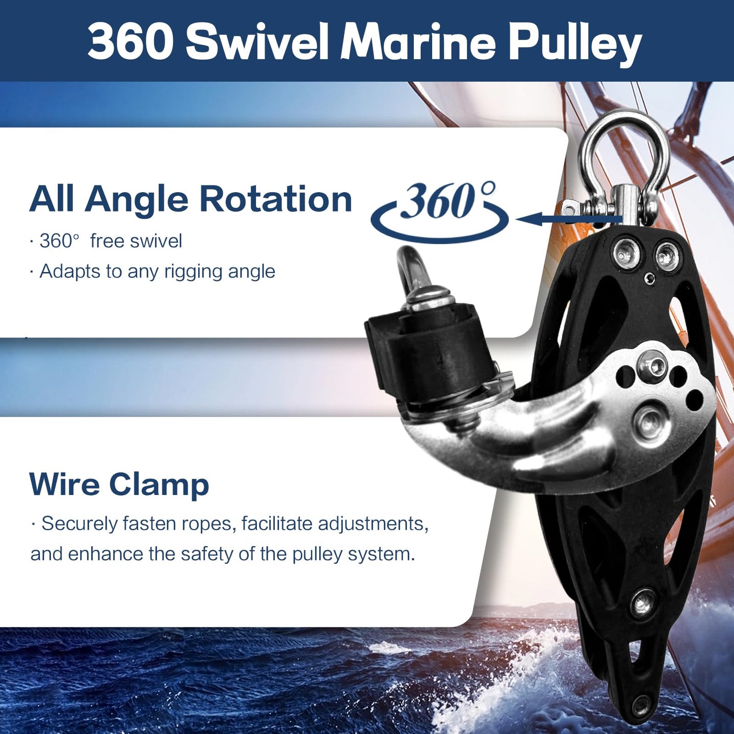 - 🔄 Swivel & Becket Design: The 360° swivel head prevents line twists, while the integrated becket (anchor point) allows you to build 3:1 or 4:1 purchase systems easily.