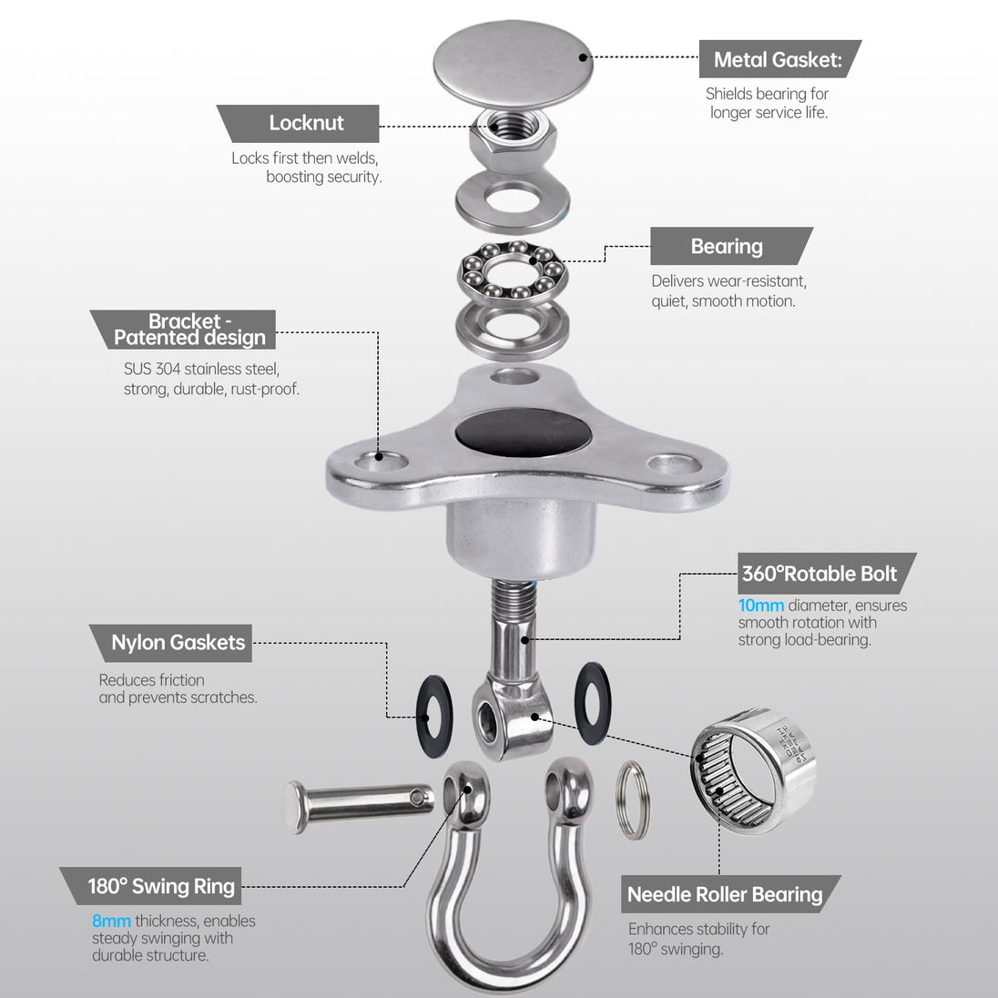 - 🔄 360° + 180° Freedom: Dual-axis design enables complete rotation and back-and-forth swinging simultaneously, preventing chain tangles and ensuring smooth motion.