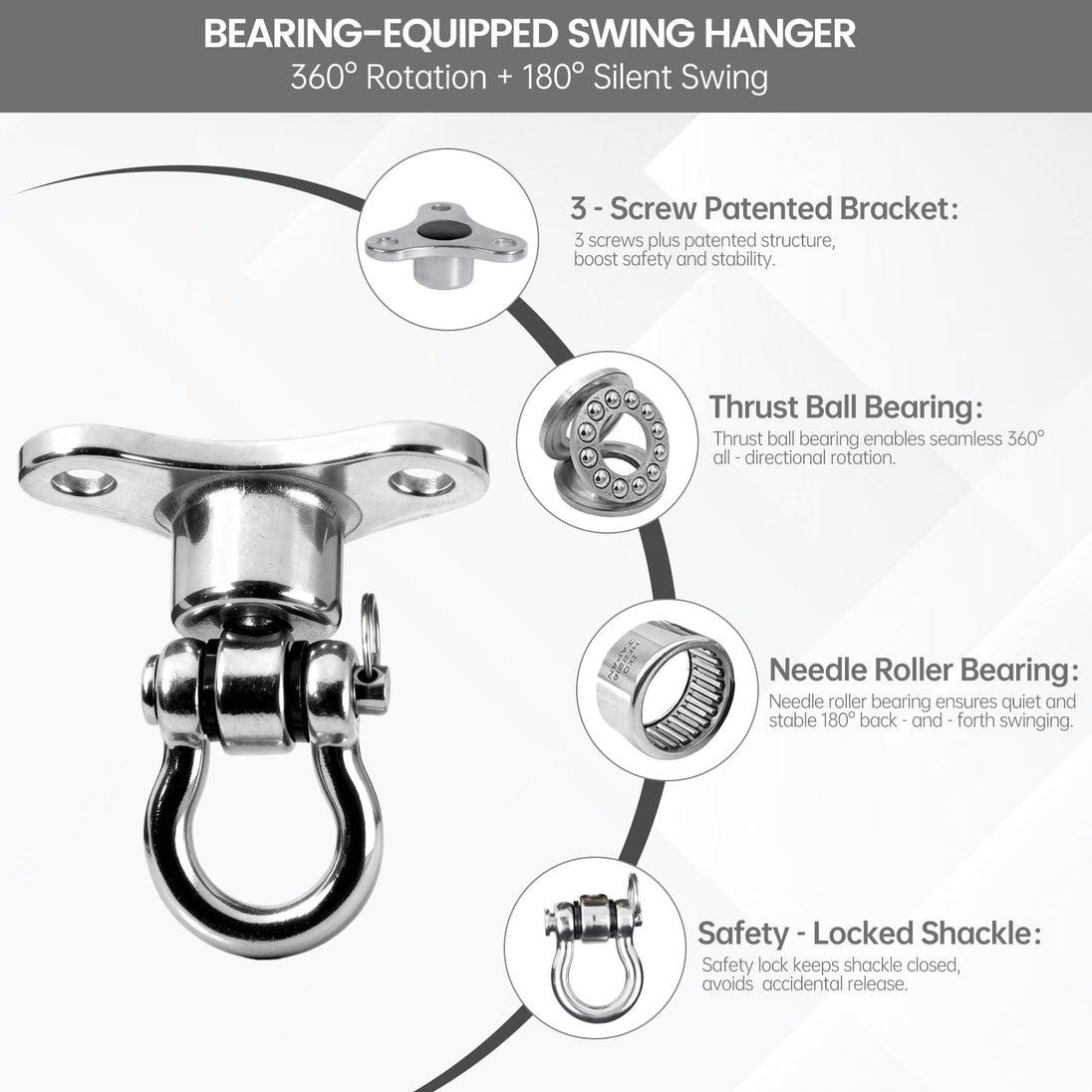 Transform your porch, playroom, or home gym with the RiaYer Heavy-Duty Swivel Swing Hanger. Unlike standard hooks that squeak and wear out, this industrial-grade hanger features an advanced Load Thrust Bearing system. This innovative design ensures frictionless, silent movement, allowing for a full 360° swivel and 180° swing motion without jamming or twisted chains. Built from rustproof 304 stainless steel, it is engineered to support up to 1,500 lbs, making it the safest choice for everything from children's swings to professional aerial yoga rigs.