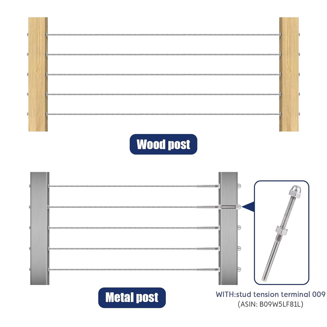 - 🪵 Versatile Compatibility: Designed for 1/8" wire rope. It fits perfectly into Wood Posts (4x4, 6x6) and can also be used on Metal Posts (with appropriate hole sizing).