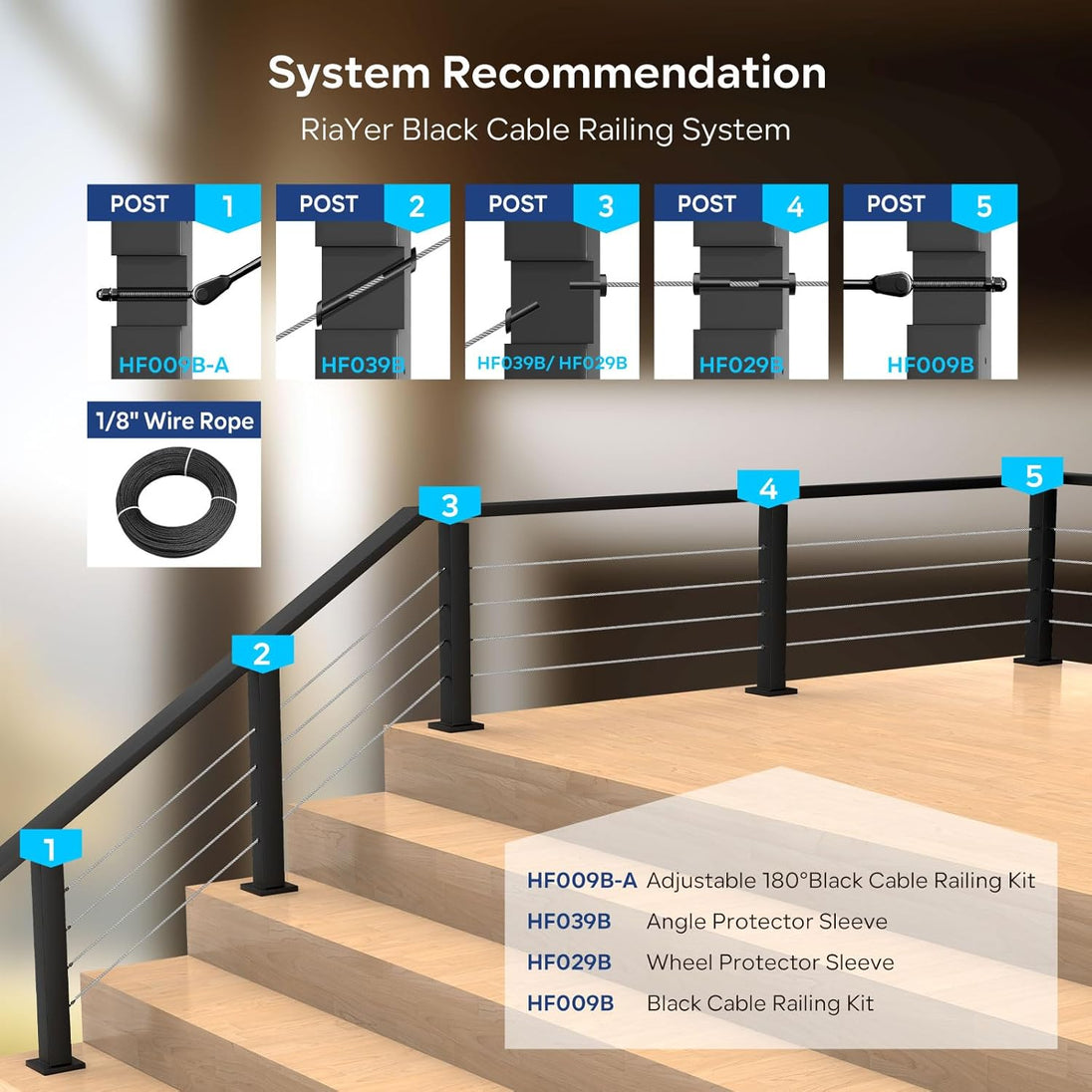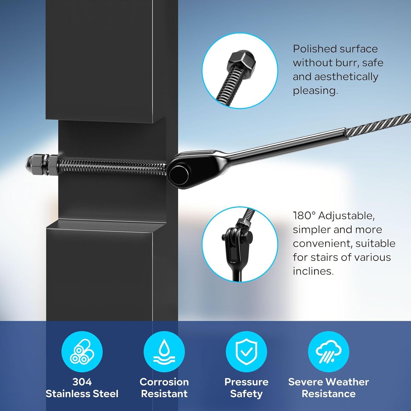 Build a professional railing with the RiaYer Black Adjustable Turnbuckle System. This kit is engineered with a 180° Foldable Swivel Joint that automatically adapts to any angle, making it perfect for complex staircases and deck transitions.