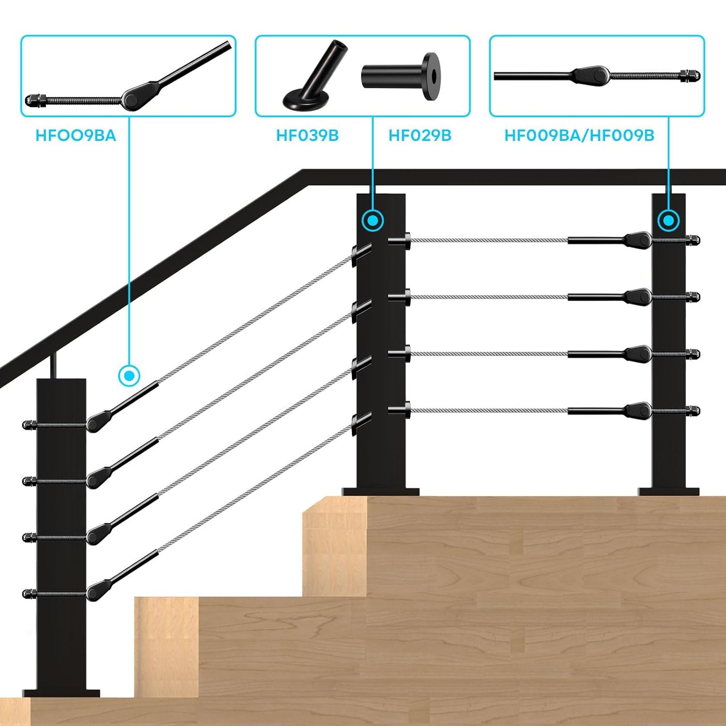 A complete structural kit featuring 180° foldable swivel ends for stairs and adjustable threaded tensioners. Includes all necessary nuts, washers, and decorative caps. Finished in durable Black PVD.