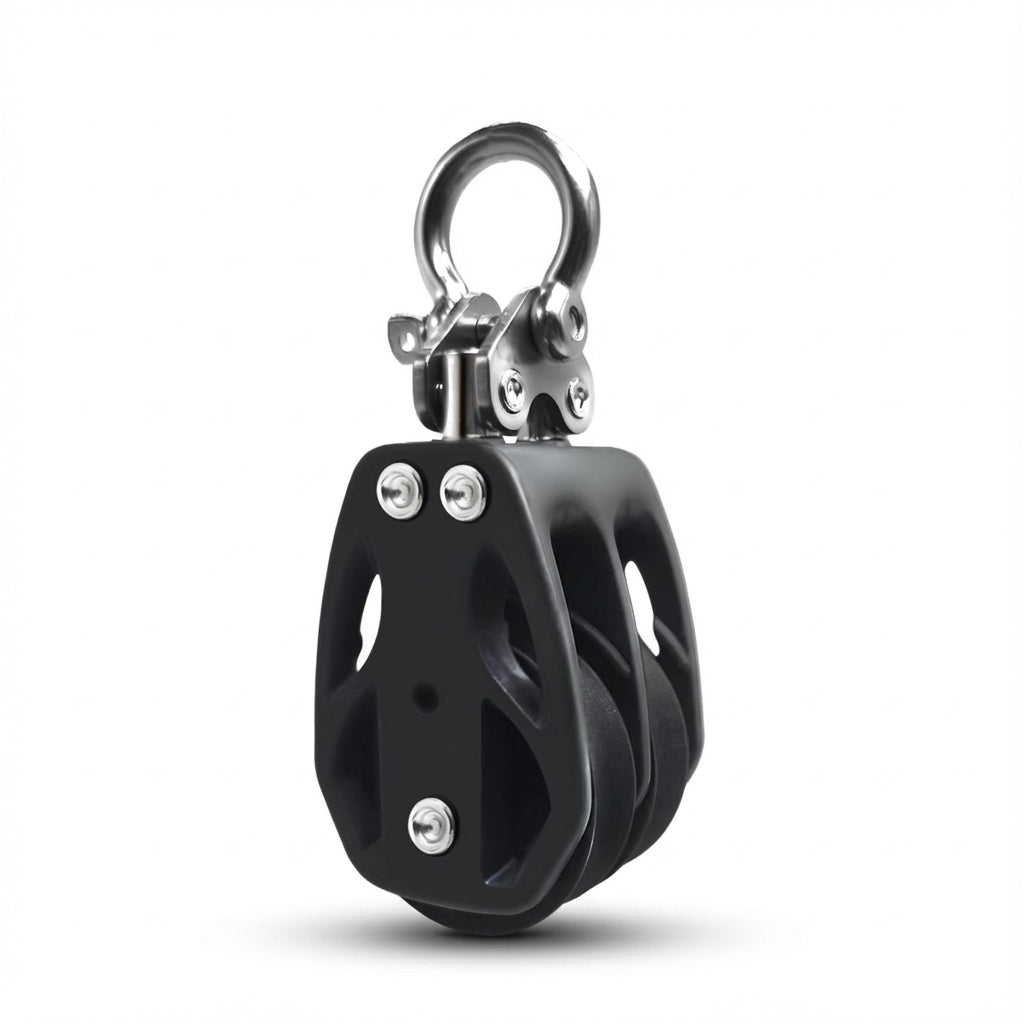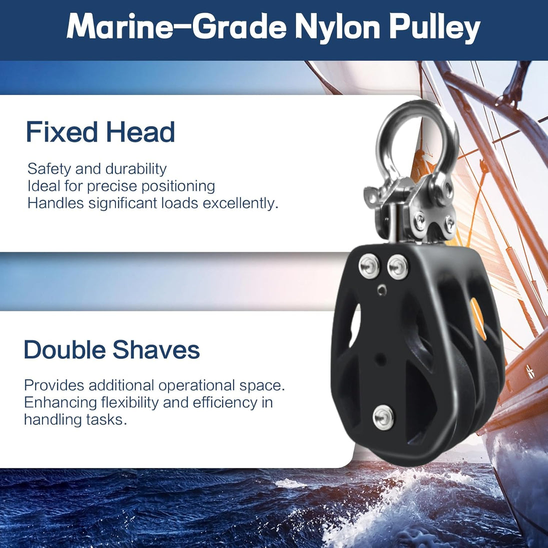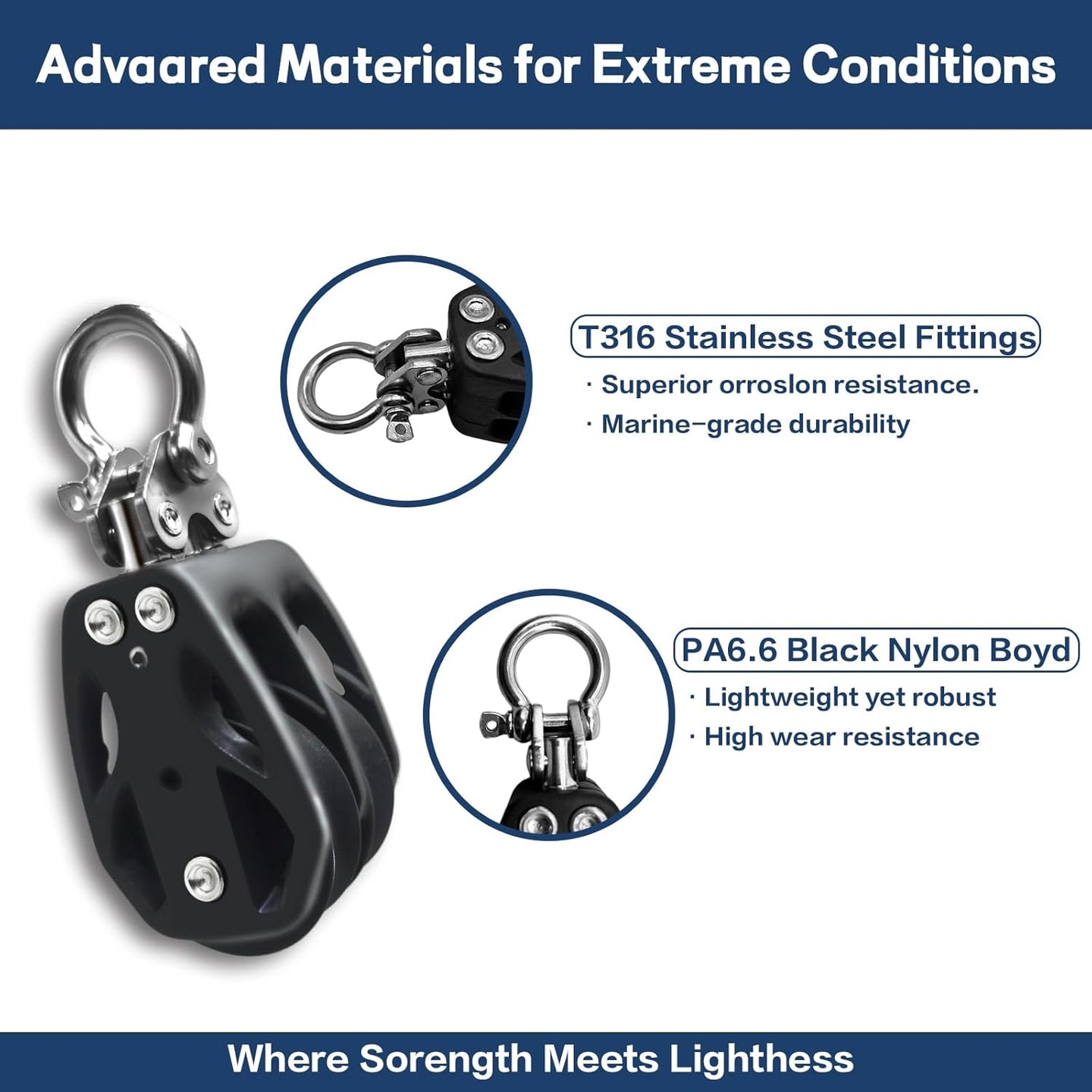 Hybrid Construction: T316 Stainless Steel Hardware + PA66 Nylon Body. Double Sheave Efficiency.